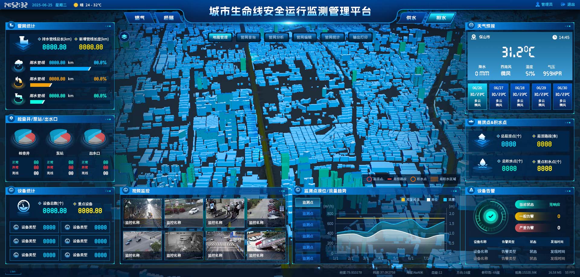 城市生命线安全运行监测管理平台是一个高度专业化的数字化综合管理系统,面向排水、供水、燃气、桥梁、隧道等关键基础设施,提供全生命周期、全要素的一体化监测与 管理能力。平台可实现对城市排水系统中的管网本体、排水设备、易涝区域及监测站点的实时感知和动态监管,精准识别并预警各类积水及运行异常风险,显著提升城市内涝 等突发事件的应急响应与协同处置能力,全面守护城市运行安全。